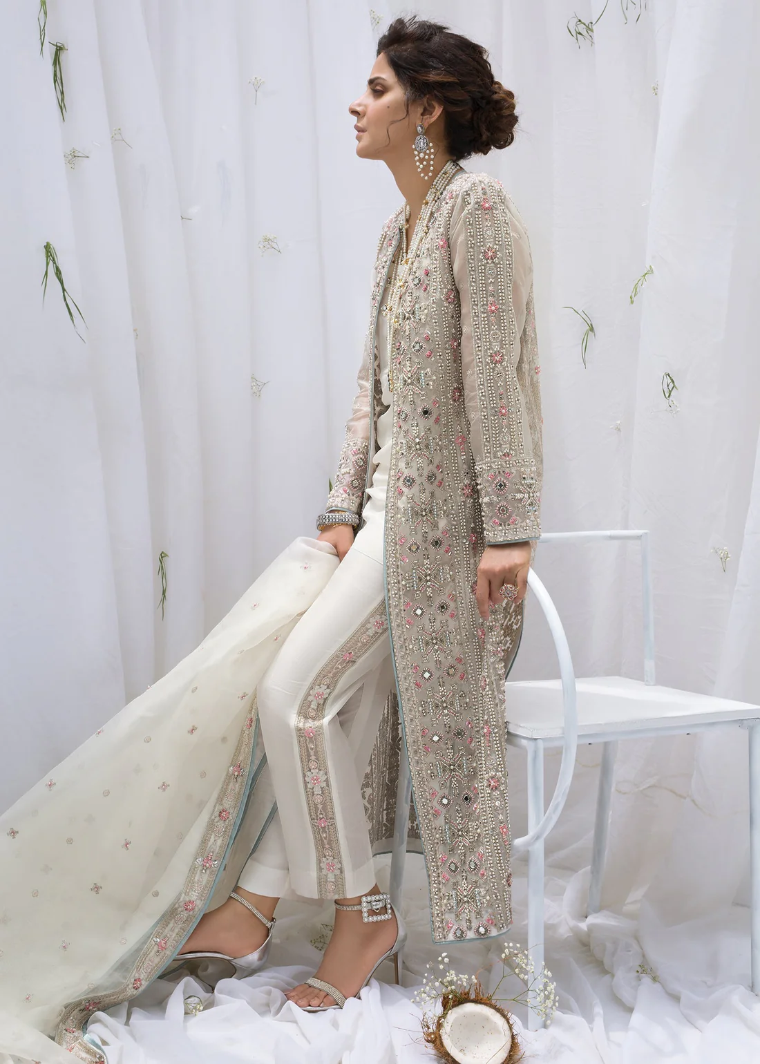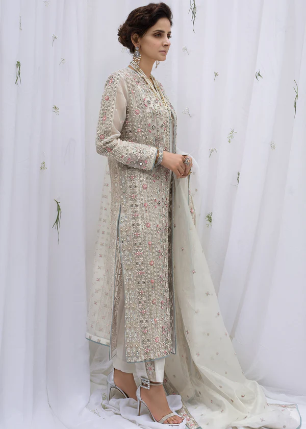 • Embroidery: The intricate hand embroidery is done with fine threads in silver, gold, and pale pink, giving the outfit a multi-dimensional and luxurious texture.