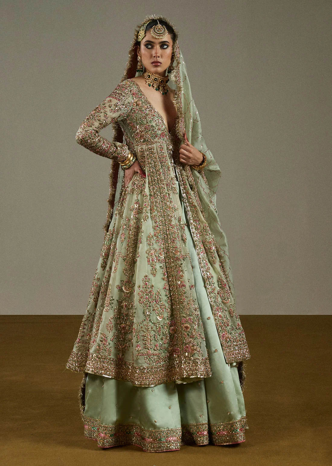 Step into the world of elegance with the Celestial Green bridal masterpiece. Crafted with luxurious Organza fabric for the Pishwas and complemented with soft dyed trousers, this bridal attire features intricate embroidery and embellishments, adding a touch of regal beauty to your special day. The organza dupatta completes the look with delicate detailing, making it a perfect choice for weddings, engagements, and other festive occasions.