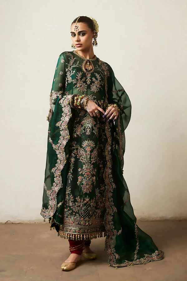 - Dupatta: Completing the ensemble is an embroidered jaal organza dupatta, featuring four-sided borders that beautifully enhance the sophistication of this attire.