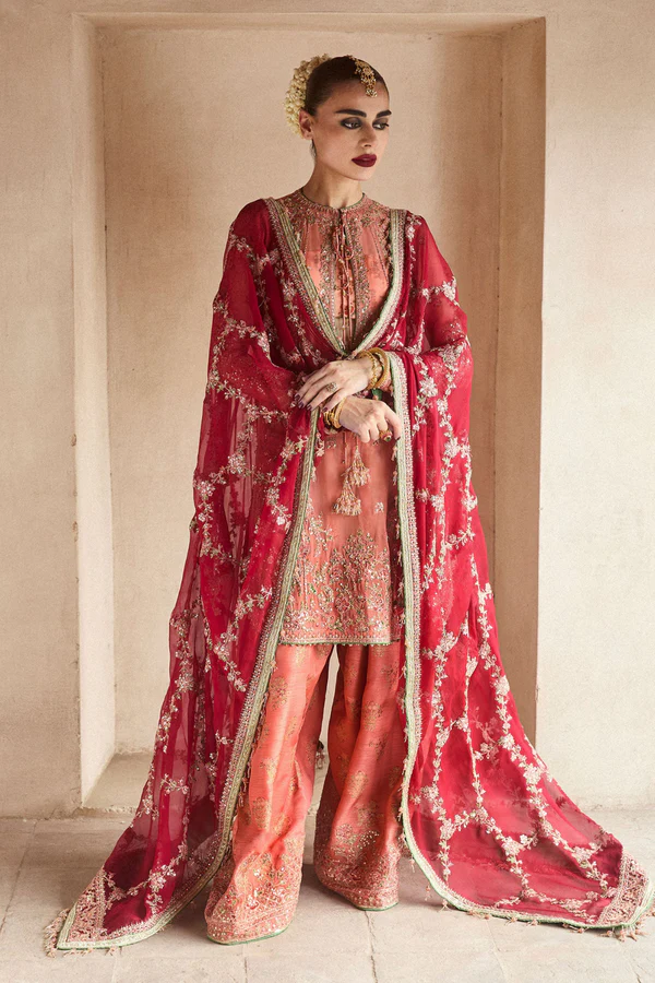 The look is completed with an intricately embroidered chiffon dupatta, featuring a unique jaal design and four-sided borders for a refined finish. This attire is the perfect fusion of sophistication and cultural aesthetics.