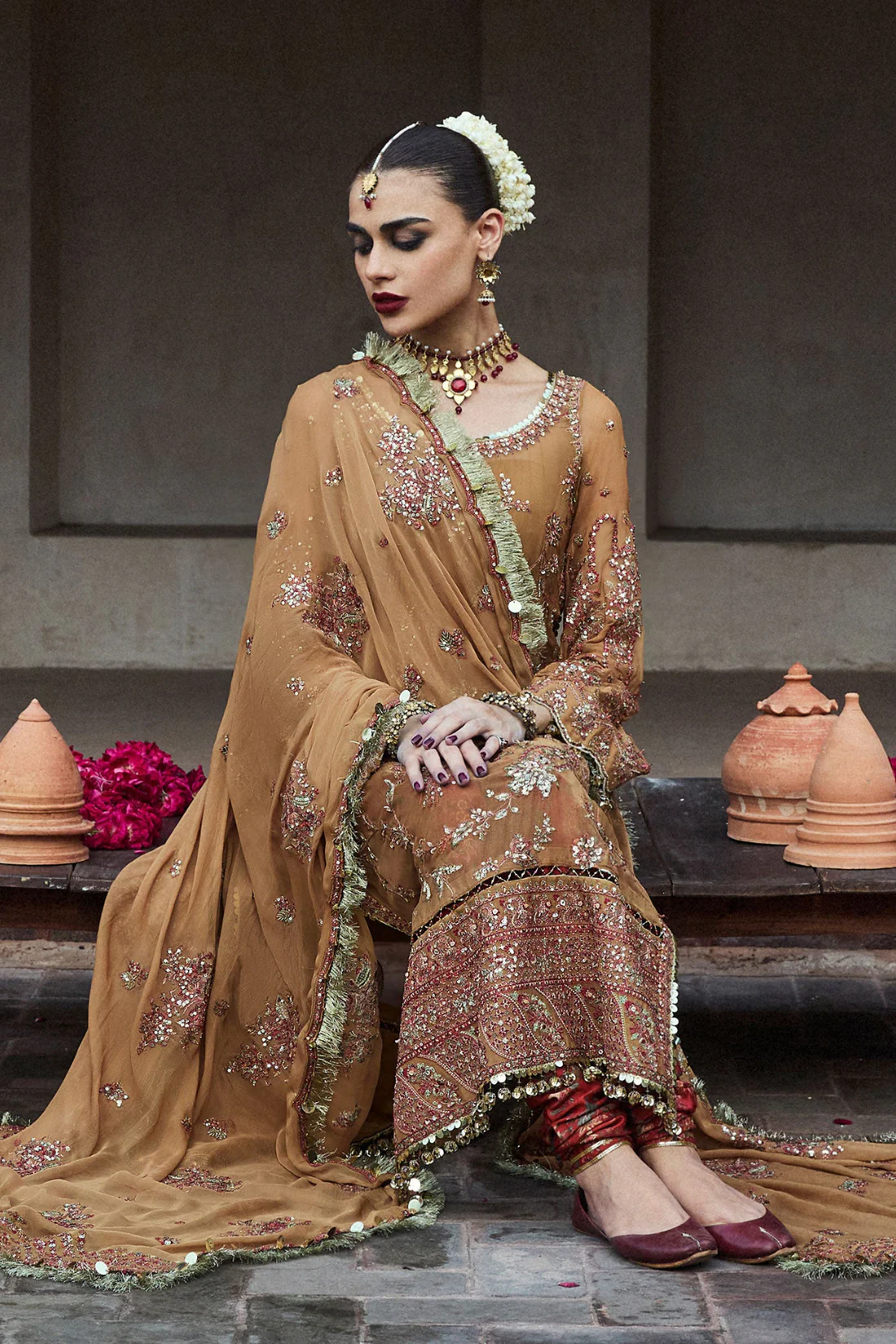 The luxurious chiffon dupatta, adorned with embroidered floral bunches and four-sided scalloped borders, completes the outfit with a strikingly beautiful finish.