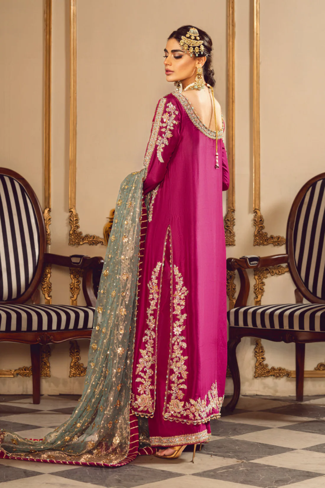 Step into luxury with Melodic Tassels, an exquisite ensemble crafted from pure raw silk. The shirt and pants showcase a lustrous sheen and a refined texture that elevate the overall appeal. Complemented by an Aqua Green dupatta adorned with intricate detailing, this outfit is a celebration of elegance and sophistication.