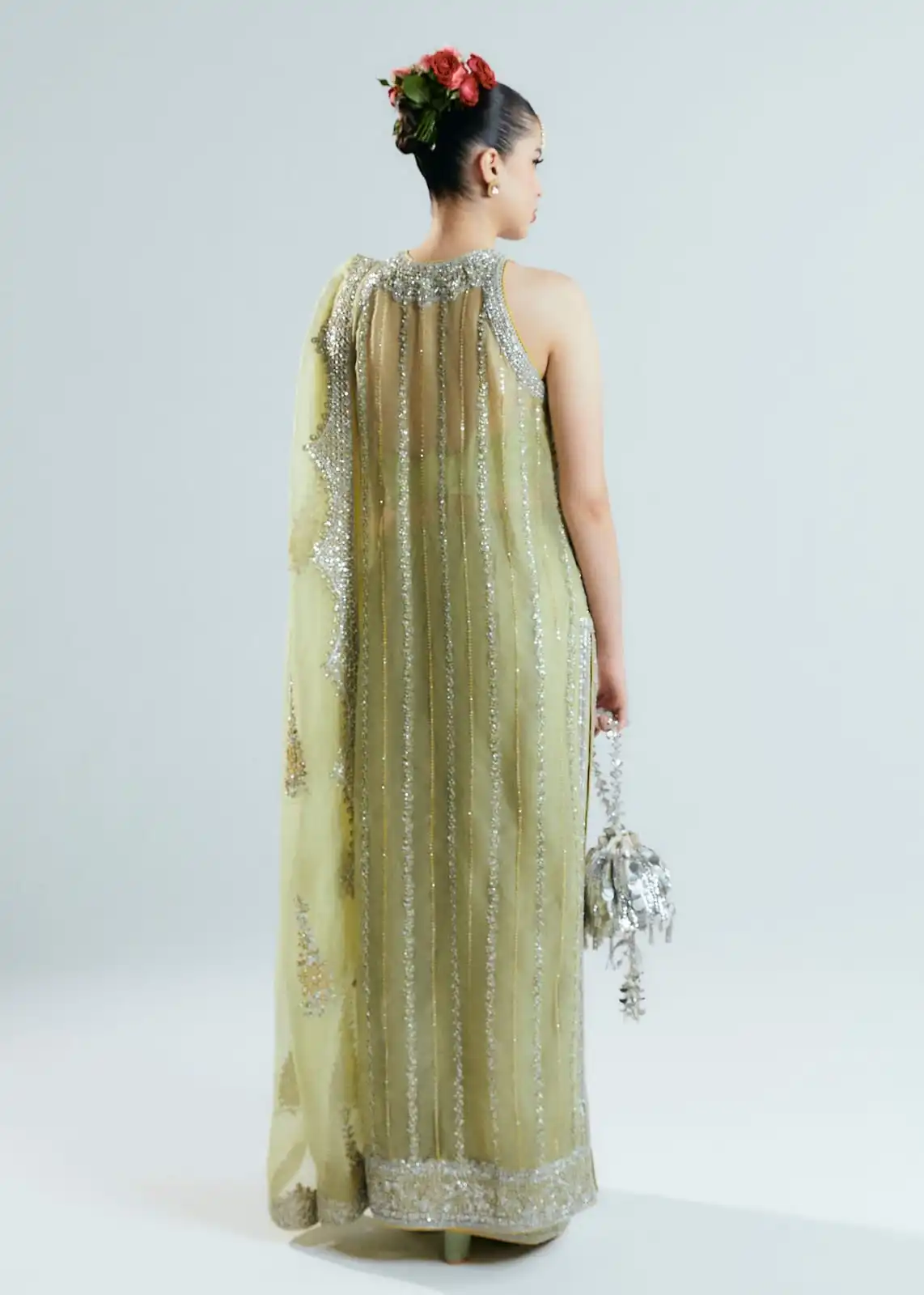 To complete the look, the organza dupatta is meticulously adorned with four-sided heavy embellished borders, featuring delicate sprays of sequins, cut dana, and exquisite nakashi and dabka work. This outfit is the epitome of grace, ideal for formal gatherings and celebratory events.