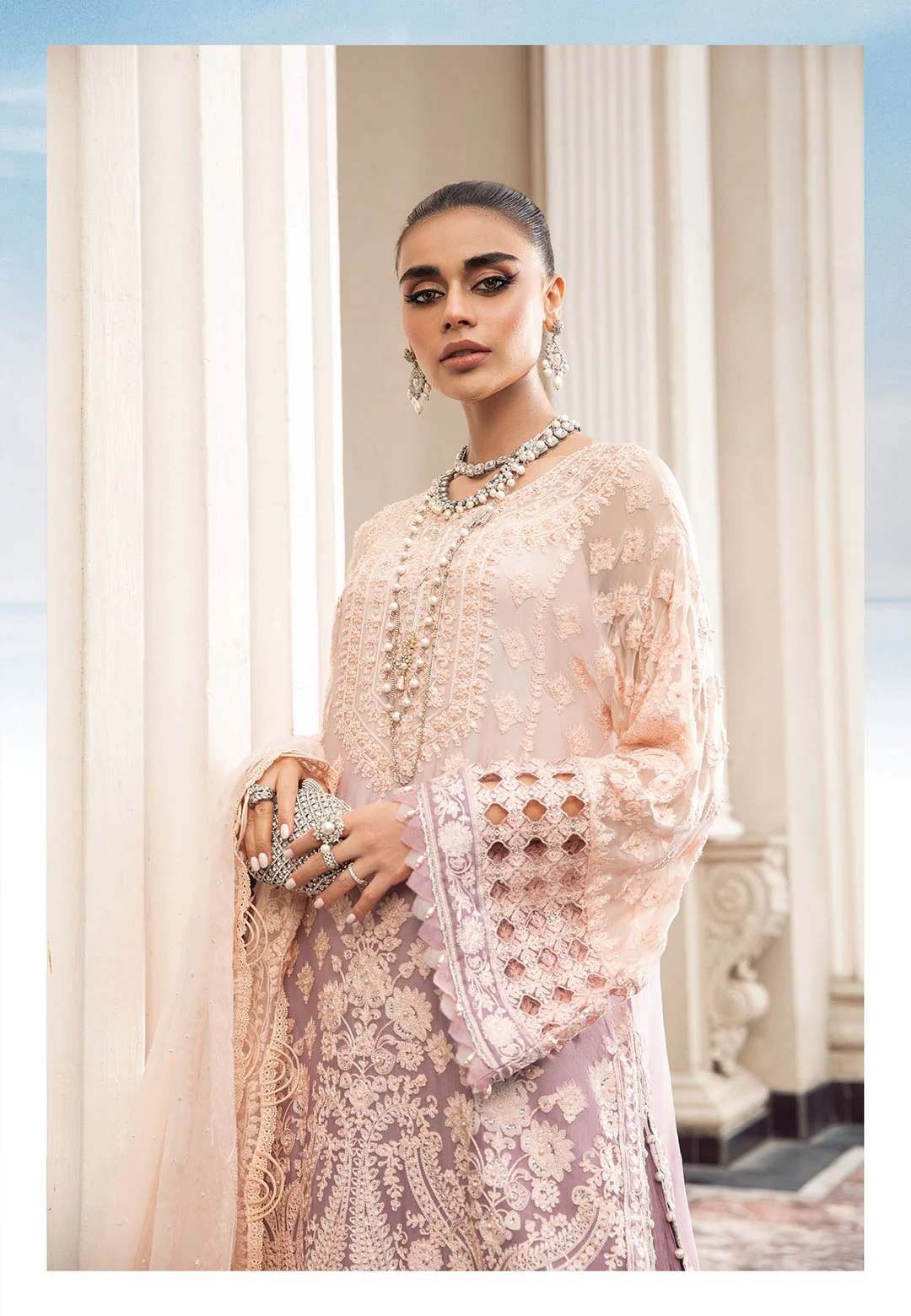 This exquisite embroidered formal dress is a masterpiece of elegance and luxury. Designed on a soft pastel base, it features intricate floral embellishments with delicate sequins, beadwork, and hand-crafted details, making it a perfect choice for festive occasions and weddings. The heavily adorned dupatta enhances its regal appeal, while the sleek silhouette ensures a graceful look.