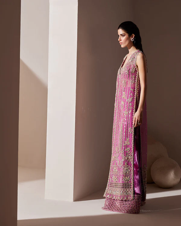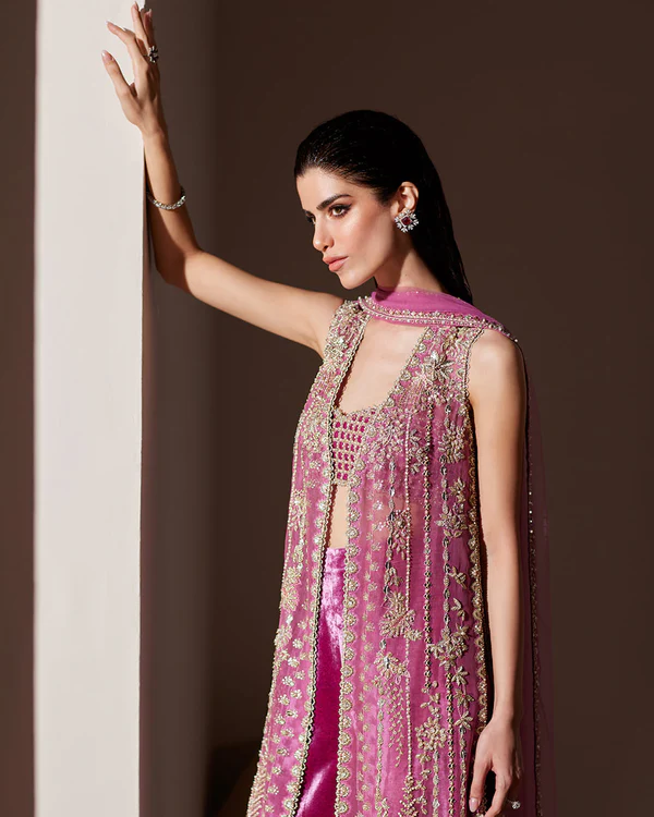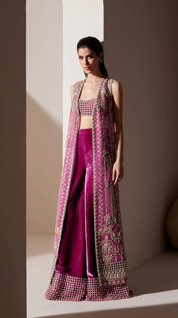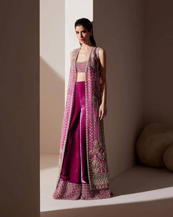 Introducing Radiance by Prince Fancy Clothing Store – a striking ensemble in a rich magenta hue, adorned with intricate hand embroidery and embellished details. Designed with a long open jacket style paired with a modern blouse and velvet trousers, this outfit is a true celebration of contemporary luxury fused with traditional artistry. The statement silhouette ensures a bold yet elegant presence, making it ideal for weddings, receptions, and high-profile festive occasions. With its meticulous craftsmanship and vibrant finish, Radiance reflects sophistication and confidence at every glance.
