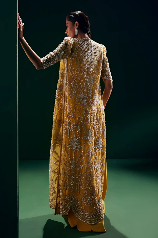 The show-stopping embroidered dupatta is an added highlight, featuring an extensive pallu with intricate designs inspired by Arabic art, which gives the outfit a unique and cultural touch. This fusion of traditional craftsmanship with modern design makes this ensemble a perfect choice for Eid dresses, festive occasions, and wedding wear.